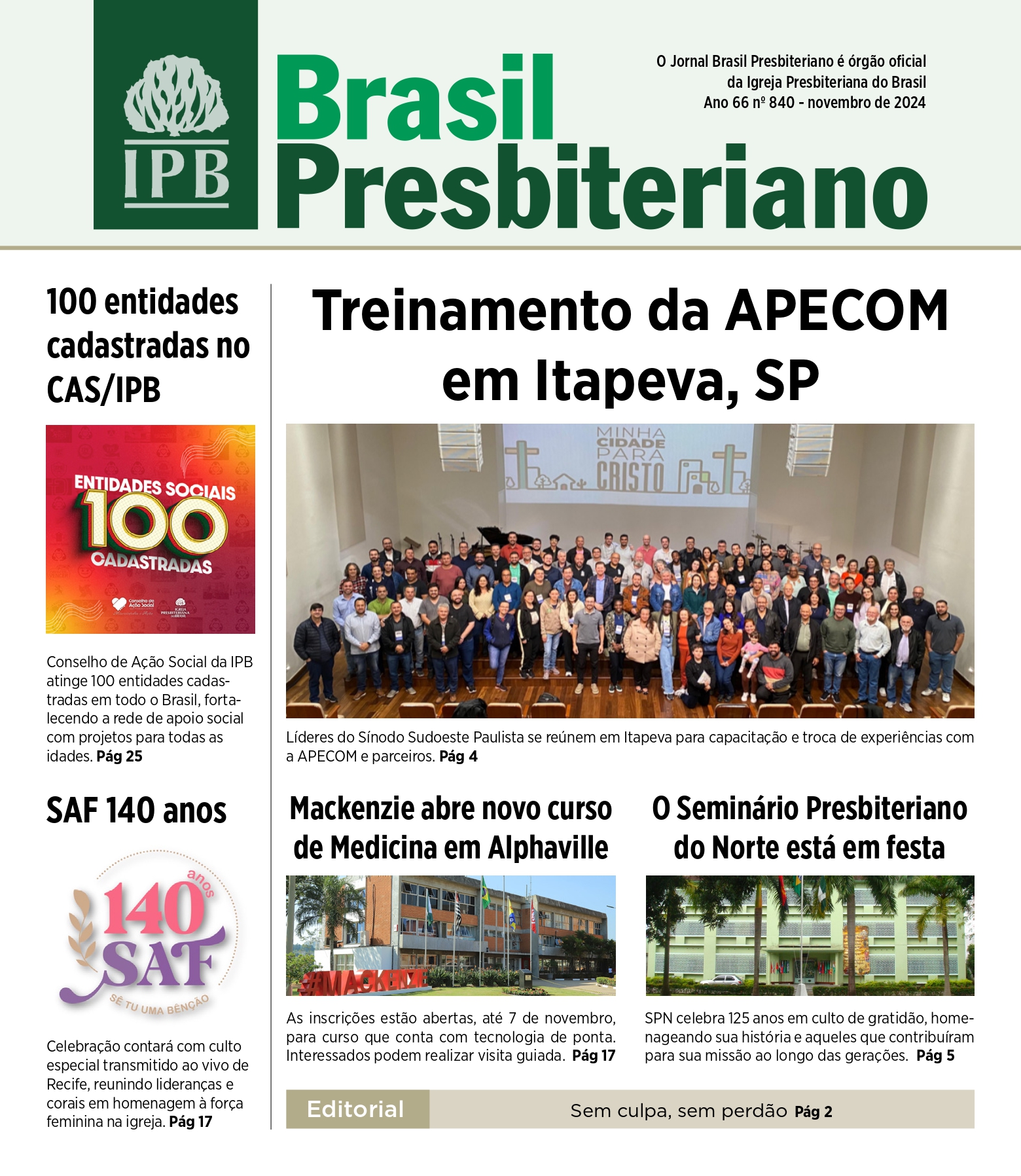 O Jornal Brasil Presbiteriano, órgão oficial de comunicação da Igreja Presbiteriana do Brasil (IPB), traz em sua edição de novembro de 2024 uma seleção especial de conteúdos. Esta edição reflete o compromisso do jornal em informar e edificar a comunidade presbiteriana. Assim, o leitor encontra, a cada página, um material preparado com o objetivo de fortalecer a fé e ampliar o conhecimento bíblico.